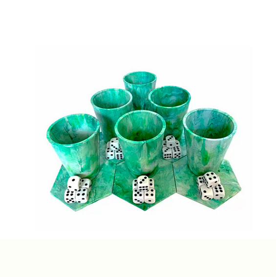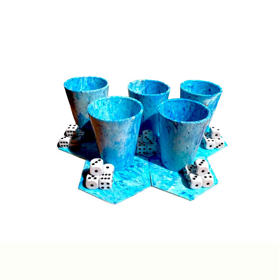 Set de juego de cachos fabricado en plástico reciclado, disponible en pack de 2, 4 o 6 unidades. Incluye dados y bolsa de algodón. Producto disponible a pedido desde 50 unidades.