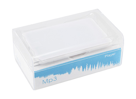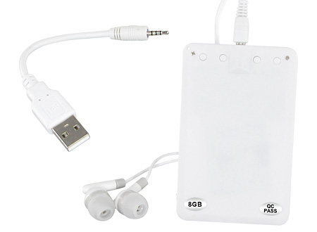 MP3 Player 8 GB, con forma de tarjeta de crédito blanca, amplia superficie para imprimir a todo color, incluye audífonos y cable cargador USB. Presentación en práctica caja acrílica transparente.