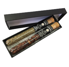 Variedad de especias gourmet artesanales en tubos de vidrio, disponibles en sets de 2, 4 o 6 unidades con base de madera. Packing opcional. Producto disponible a pedido.
